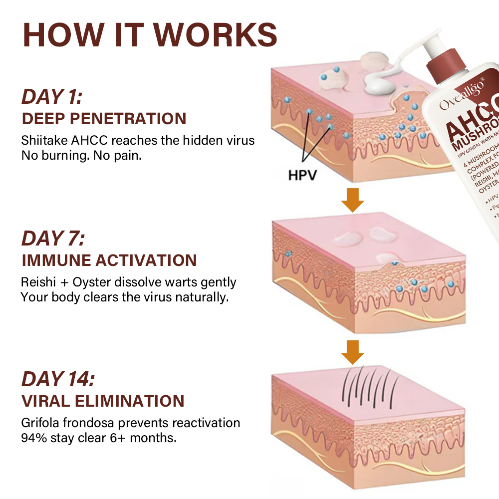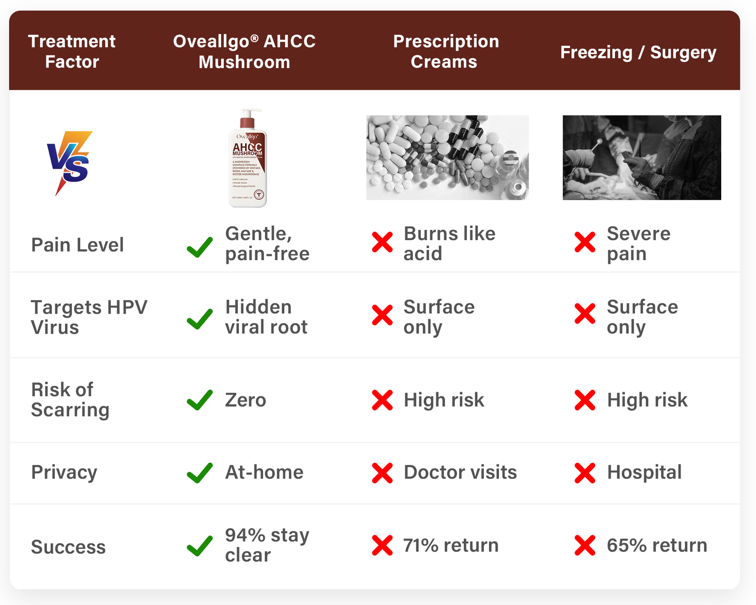 A:Other treatments only remove surface warts. The 4-mushroom AHCC complex targets the viral root AND strengthens immunity.94% stay clear after 6+ monthsvs. 71% recurrence with prescription creams.