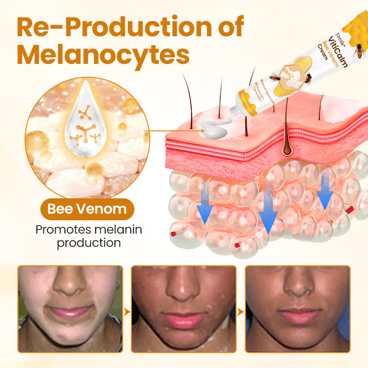 Timilk® VitiCalm Bee Venom Cream is enriched with high-activity PLA2 to help suppress this abnormal immune response, protect melanocytes, and gradually restore natural skin tone.