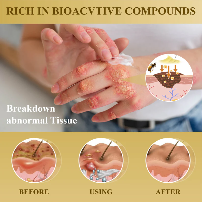 Fivfivgo® Condense Mellifera Venom Skin Repairing Cream leverages the power of Mellifera Venom to effectively break down abnormal tissue, targeting moles, warts, and other skin issues to promote a smoother and clearer complexion. Infused with 5% salicylic acid, this cream gently exfoliates and unclogs pores, enhancing overall skin texture and reducing visible imperfections. Melaleuca Alternifolia provides robust antibacterial protection to prevent infections, while Arborvitae Leaf Extract soothes inflammation and supports the skin's natural healing process. Borneol enhances the absorption of these active ingredients, ensuring a thorough approach to improving skin health and addressing a variety of skin conditions, including psoriasis, for visibly healthier and more resilient skin.