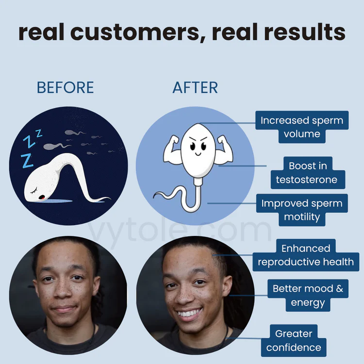 Your sperm’s DNA could be affecting more than just fertility,it could also be affecting your sex life.Low sperm quality can lead to lower a sex drive and weaker performance in the bedroom. Vytole works toenhance your vitality, increase semen volume, and boost your desire,helping you feel more connected to your partner.It’s not just about getting pregnant; it’s about reigniting your passion and performance.